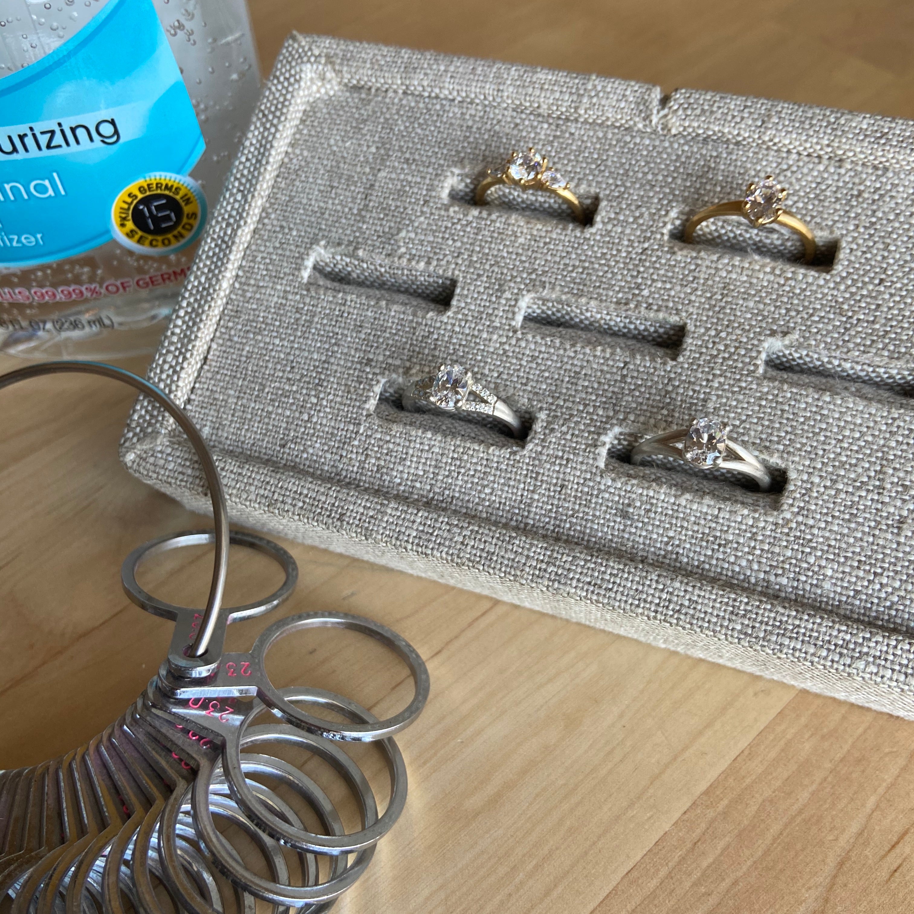 We clean the samples and the ring sizers between each appointment. Please wear a mask, try to keep six feet of distance, and we will have hand sanitizer for you to use.