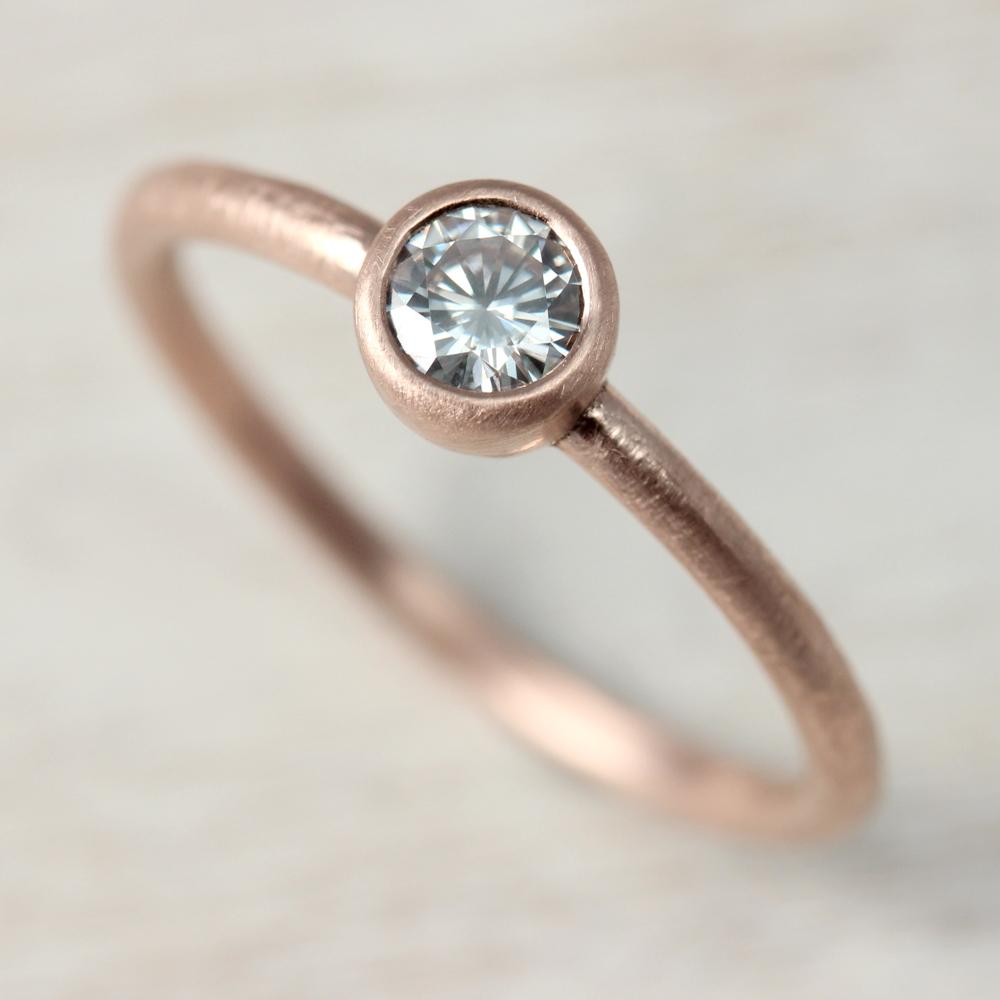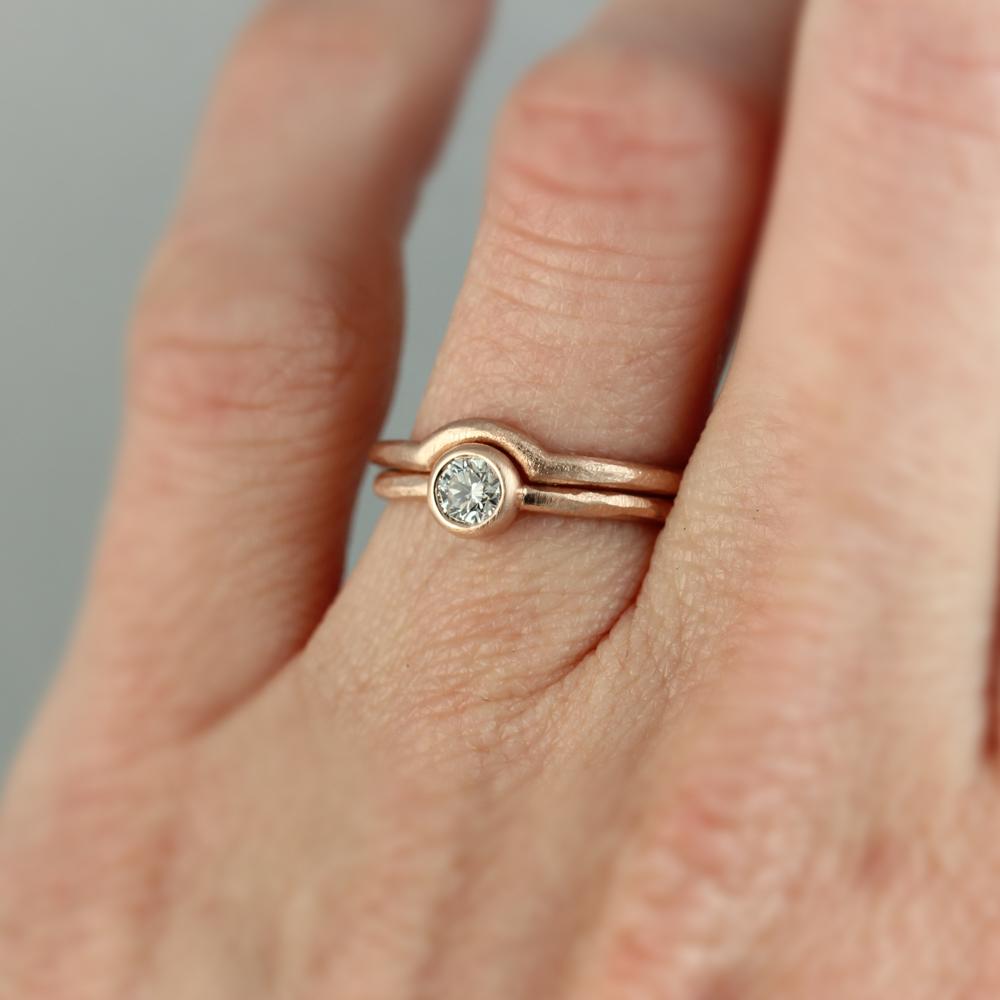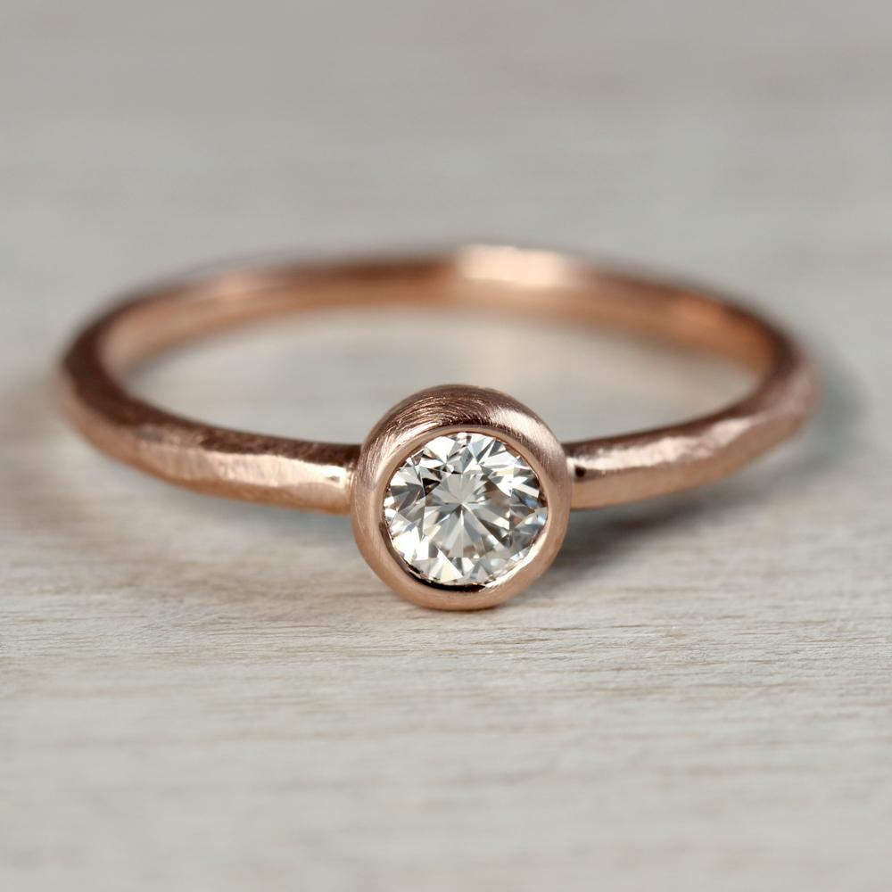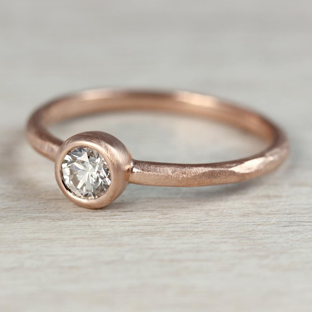Our Bezel-set Rustic Solitaire blends modern minimalism with organic texture. The 4mm round brilliant cut center stone (~0.24ct) sits within a smooth metal rim that encircles the gem completely, protecting it while creating a clean silhouette.