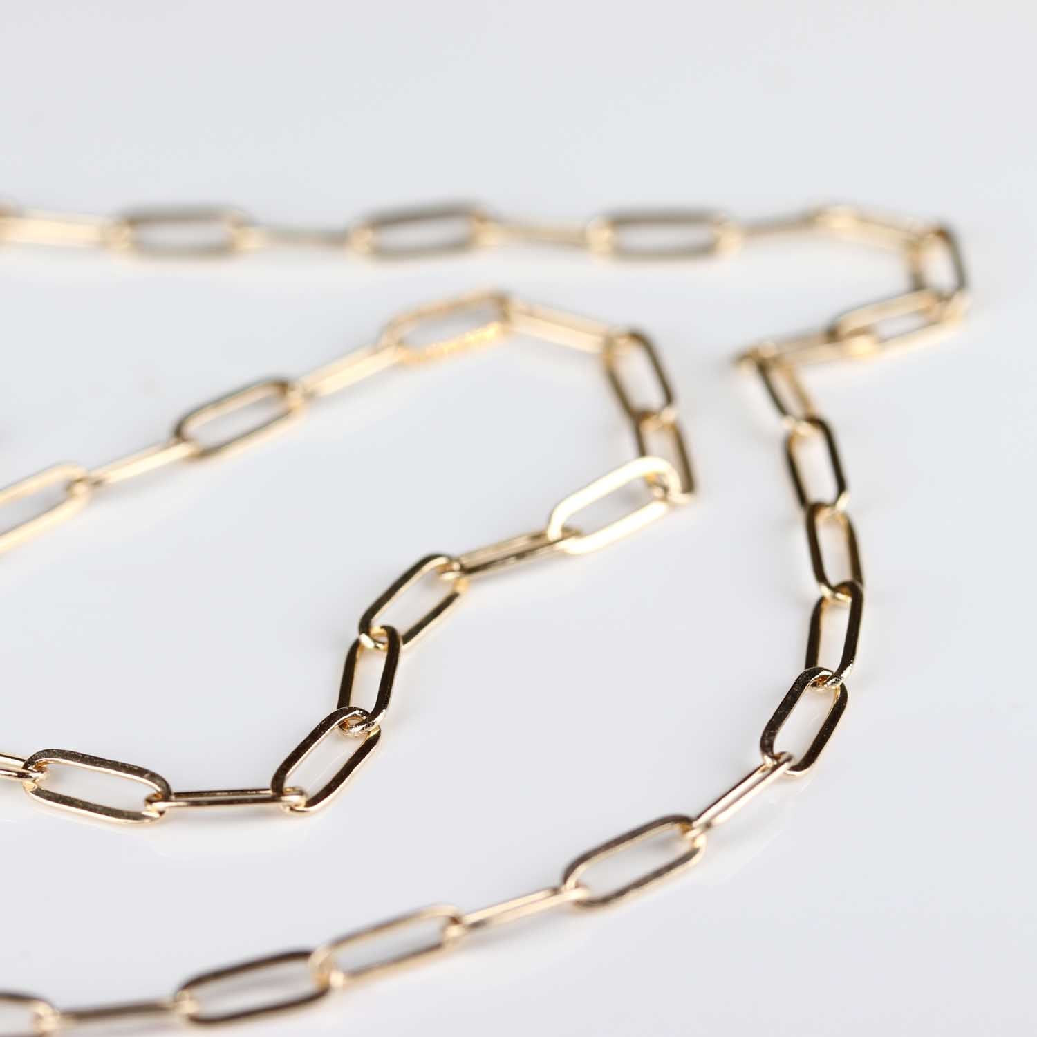 A medium-weight paperclip chain with clean, elongated oval links measuring 2.1mm wide. Bold enough to wear on its own, yet versatile enough for layering or holding charms. Finished with a secure lobster clasp.