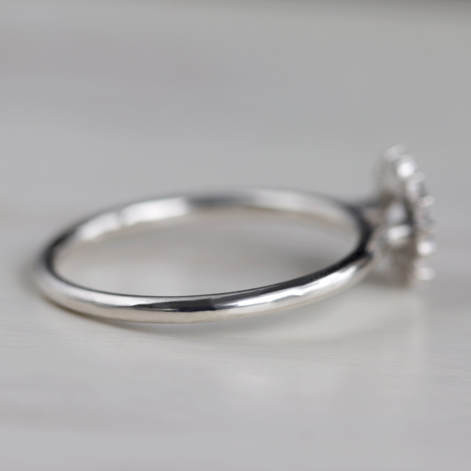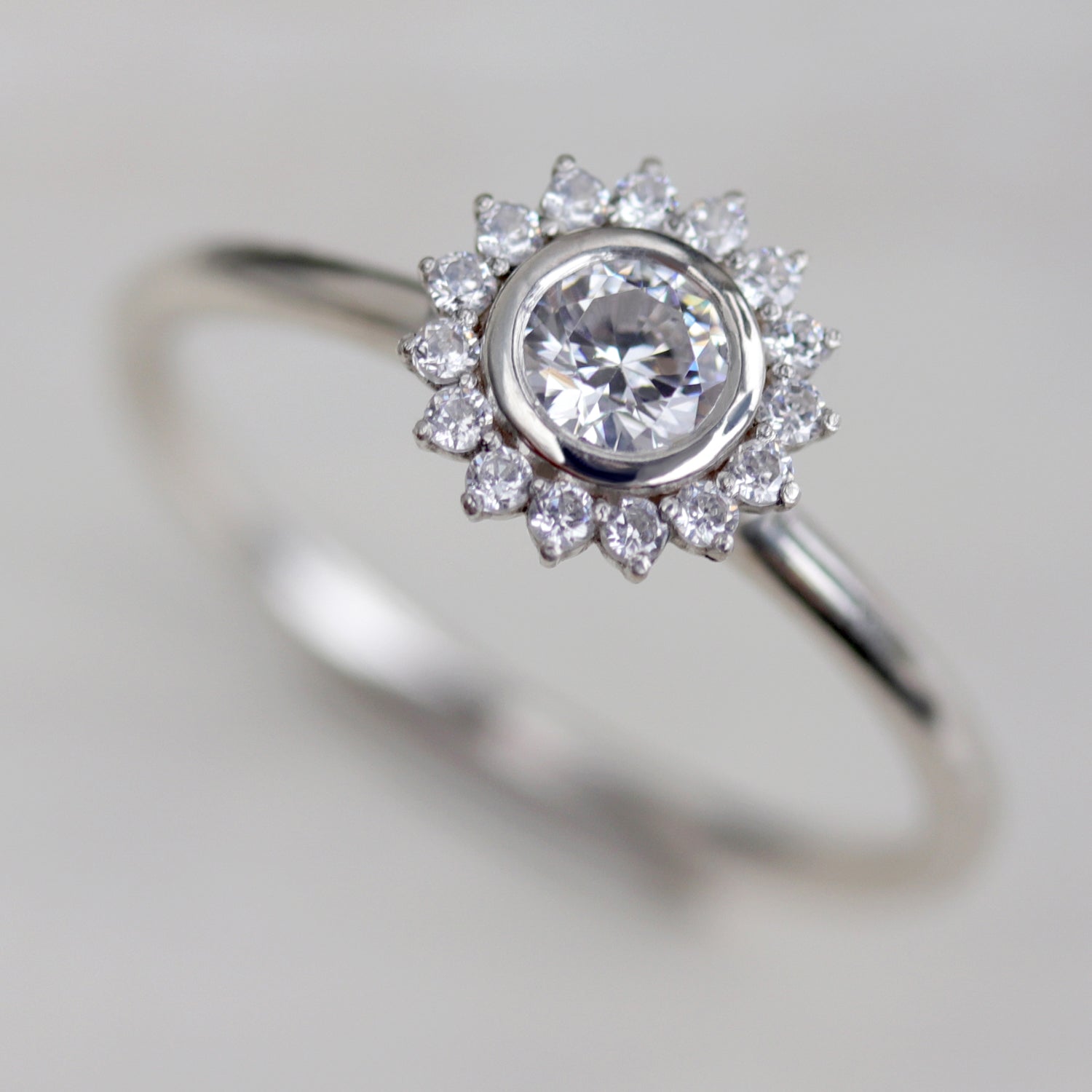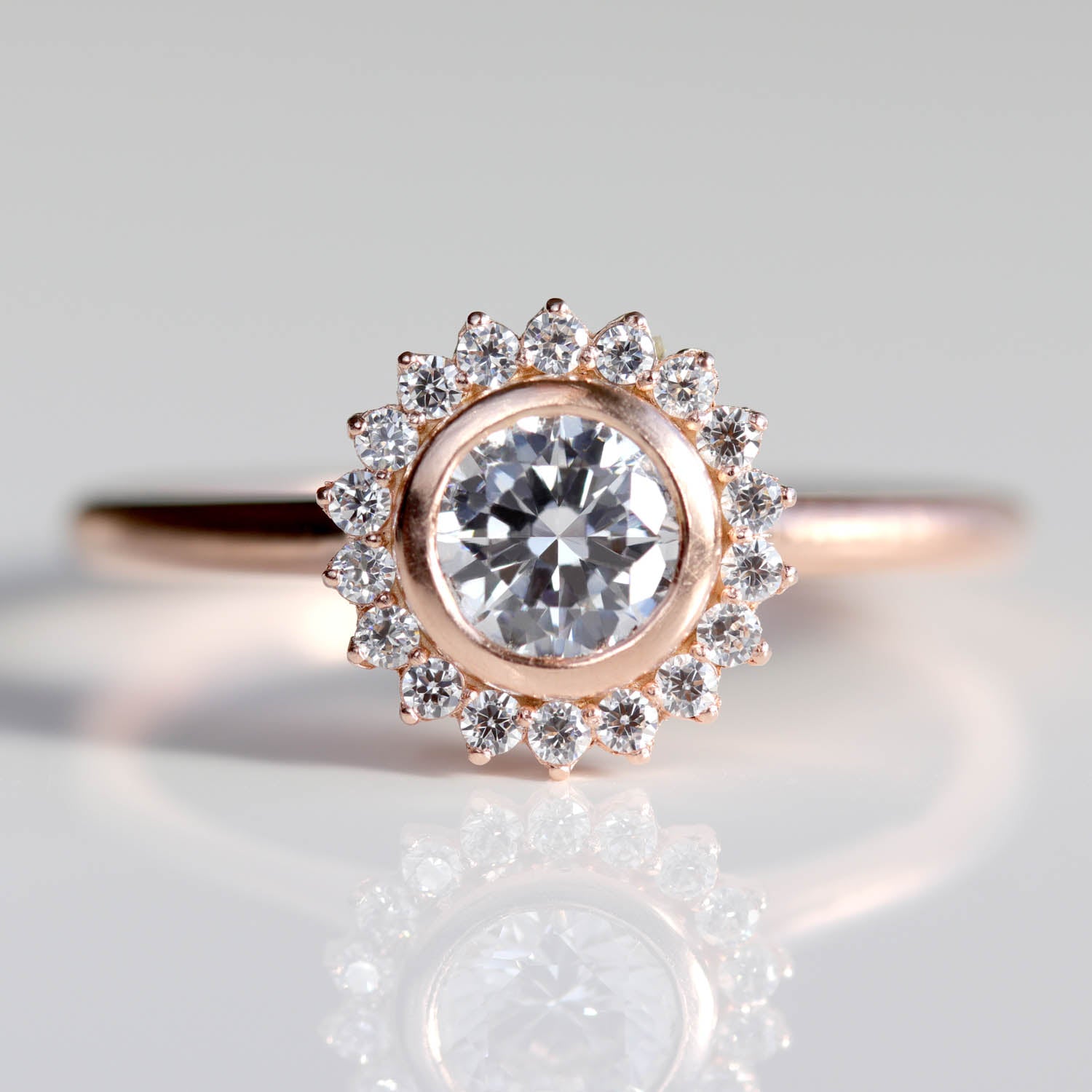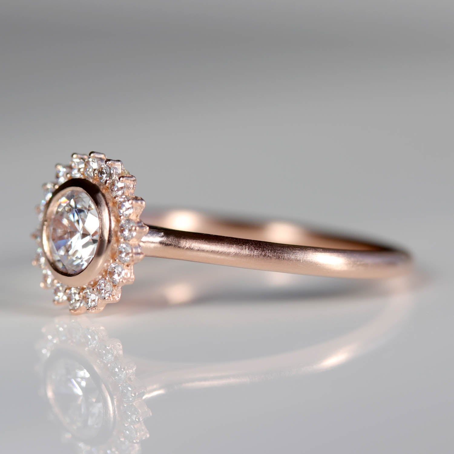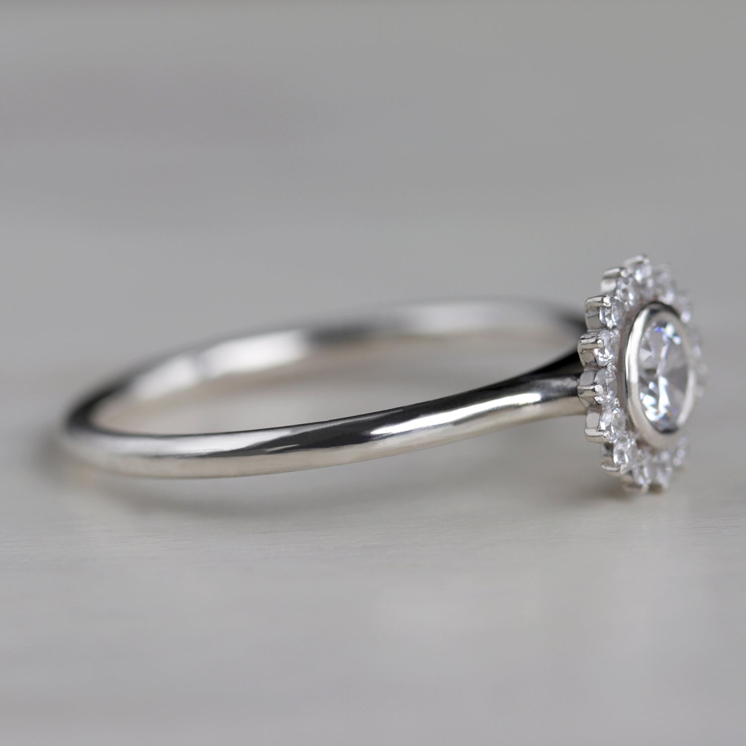 Ringed with a delicate halo of diamonds, this bezel-set solitaire is both unique and classic. This ring has a raised, open center setting, which allows for a wider range of stacking options.