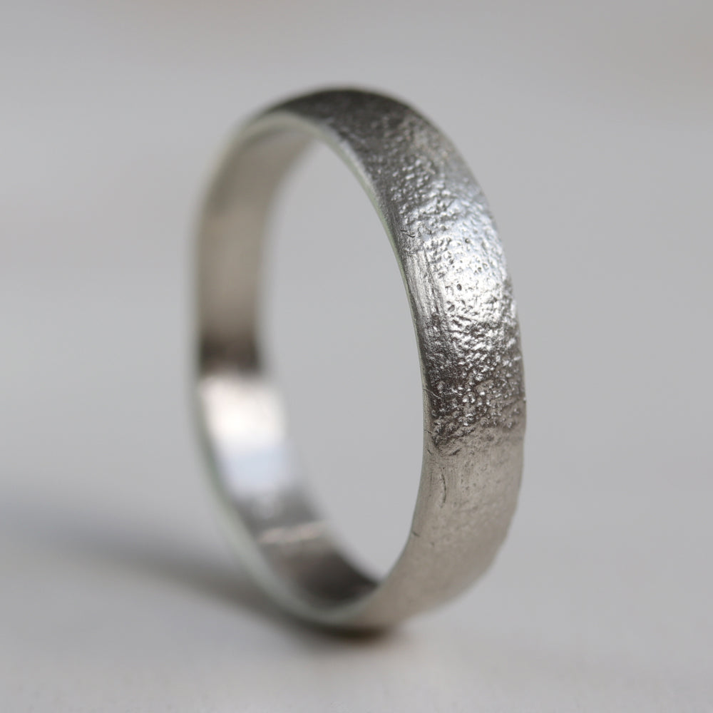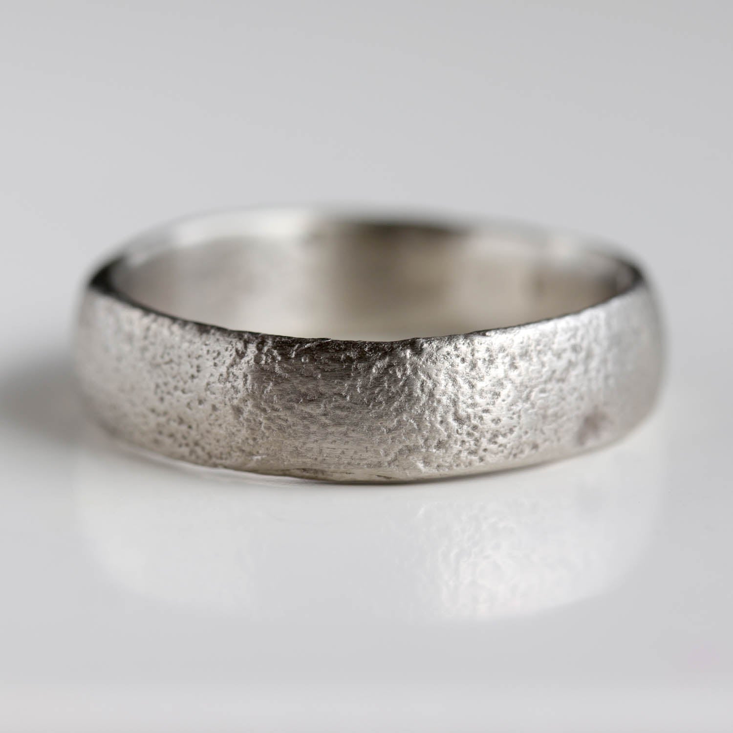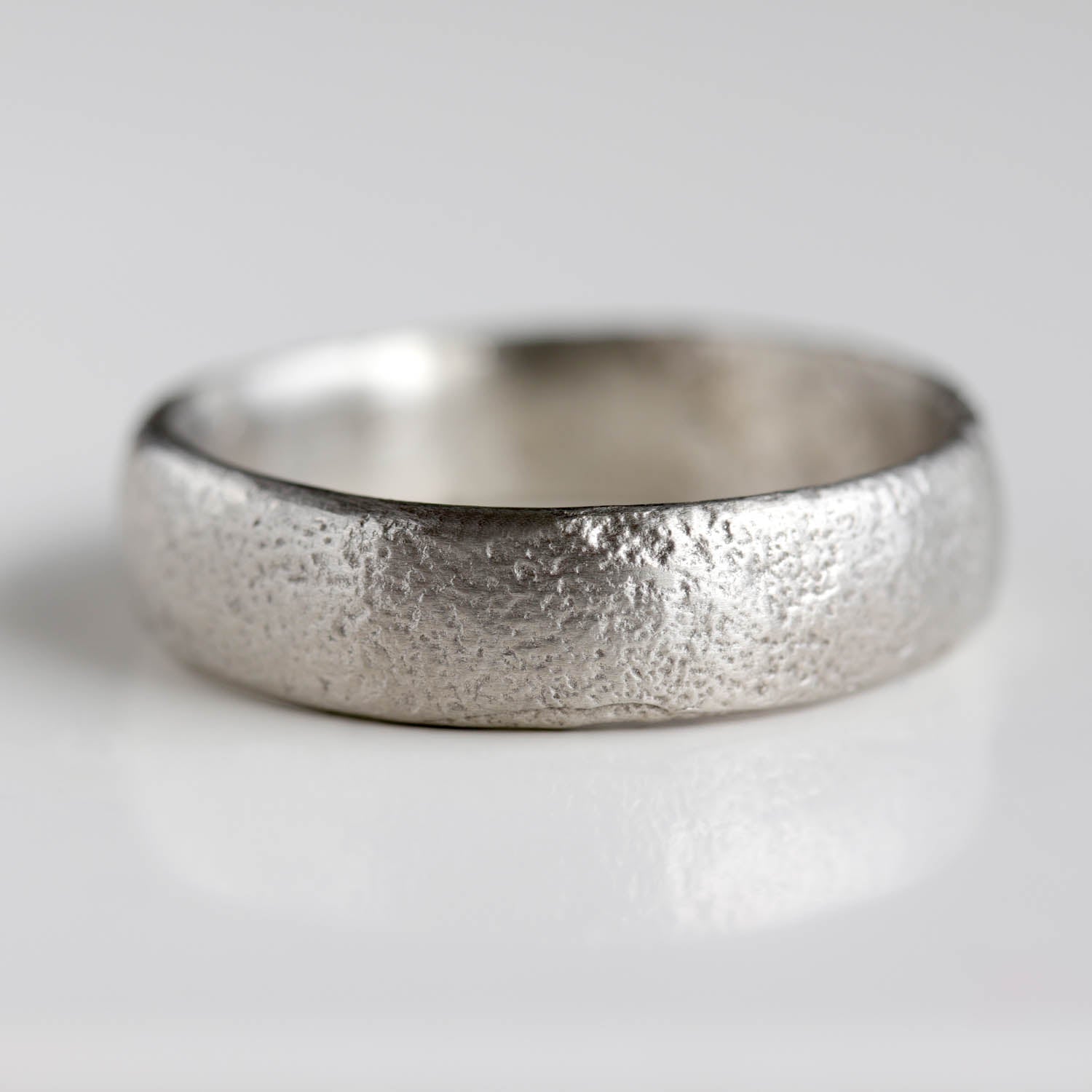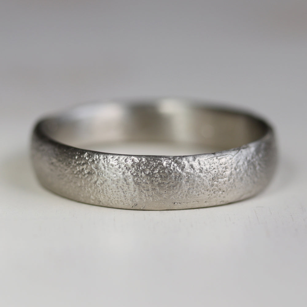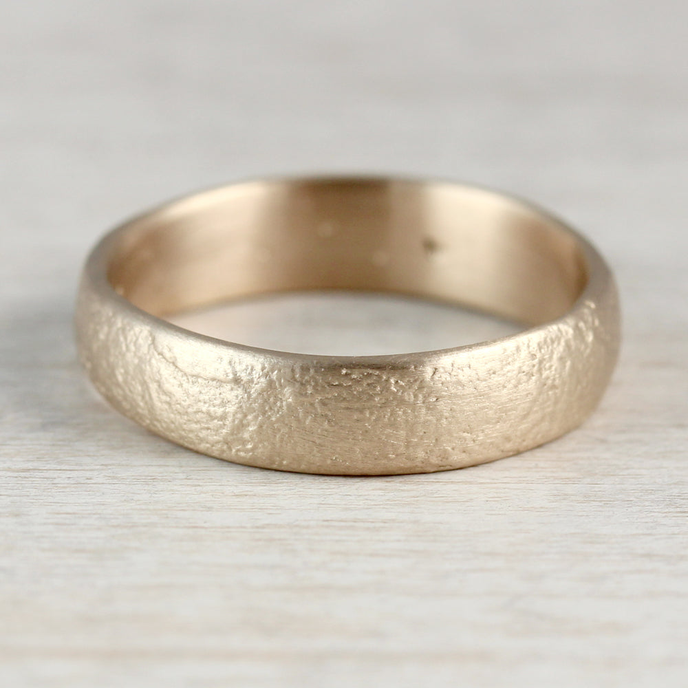 This band is dappled with naturally worn impressions embedded into the metal, giving it the look of an ancient, beloved ring. The fluctuating edges of this band echo the ebb and flow of time.