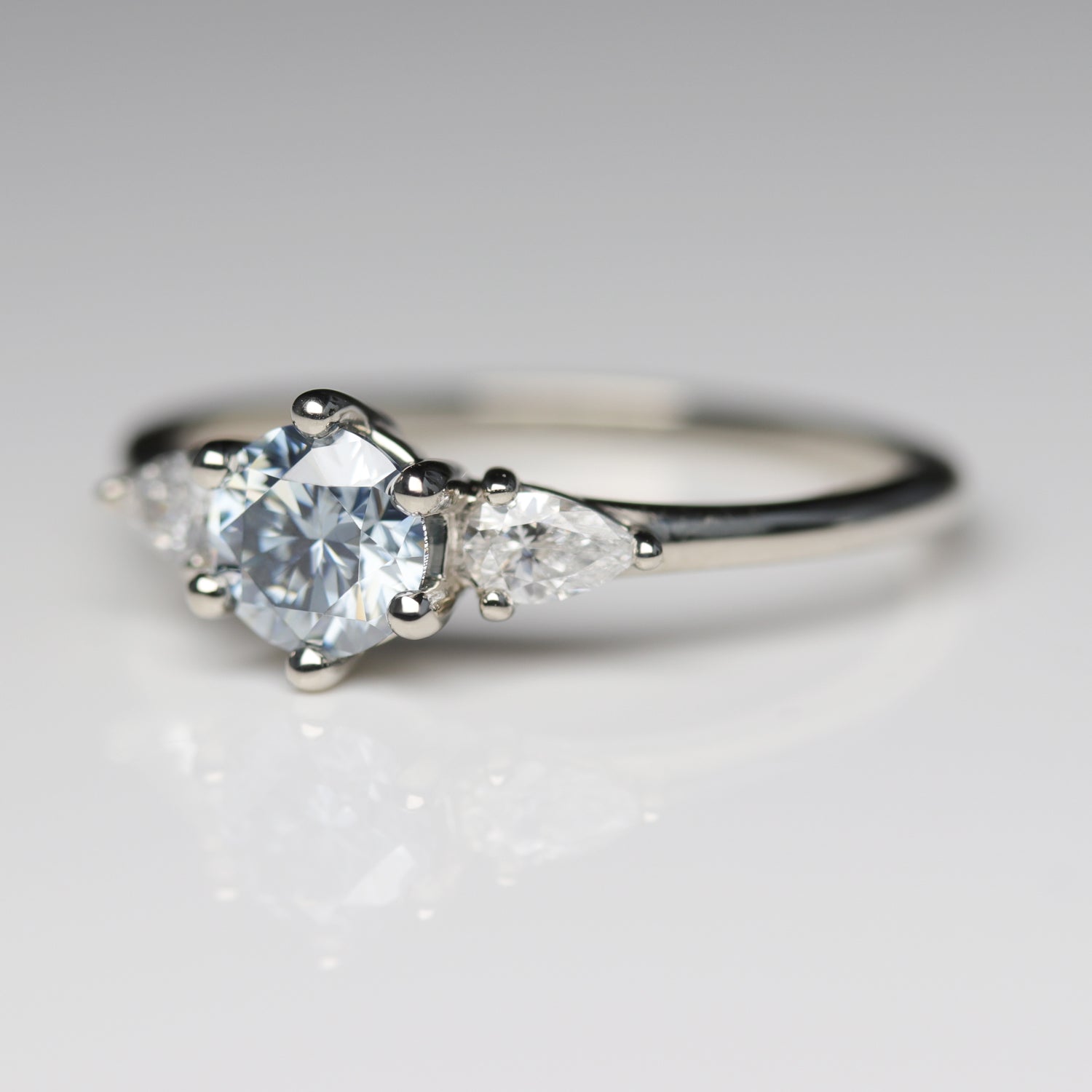 Our 5mm Prong-set Three Stone Ring with Pear Side Stones with a Light Blue Moissanite center stone and lab-grown white diamond accent stones in 14k White Gold.