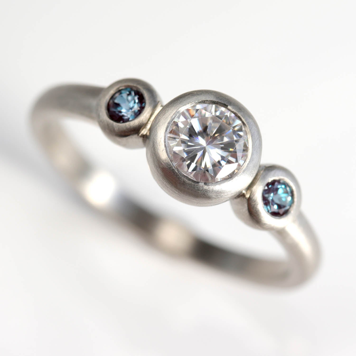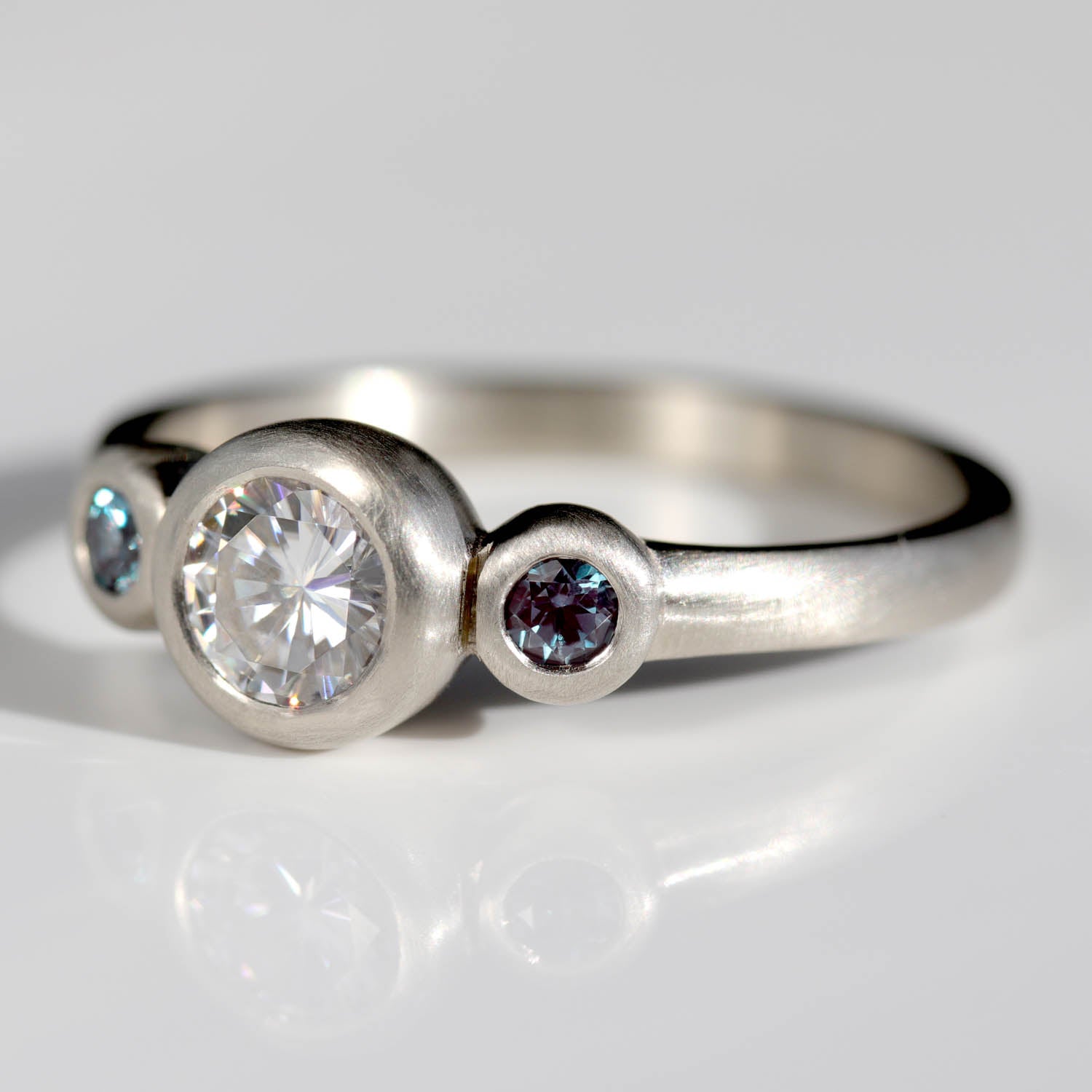 Our 5mm Three Stone Ring with a Forever One Moissanite center stone and Chatham Lab-grown Alexandrite side stones.