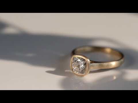 With a raised, open center setting that allows for a wedding ring to sit flush against the band (giving a wide range of options for wedding band stacking), this minimal cushion cut solitaire engagement ring is a versatile classic.