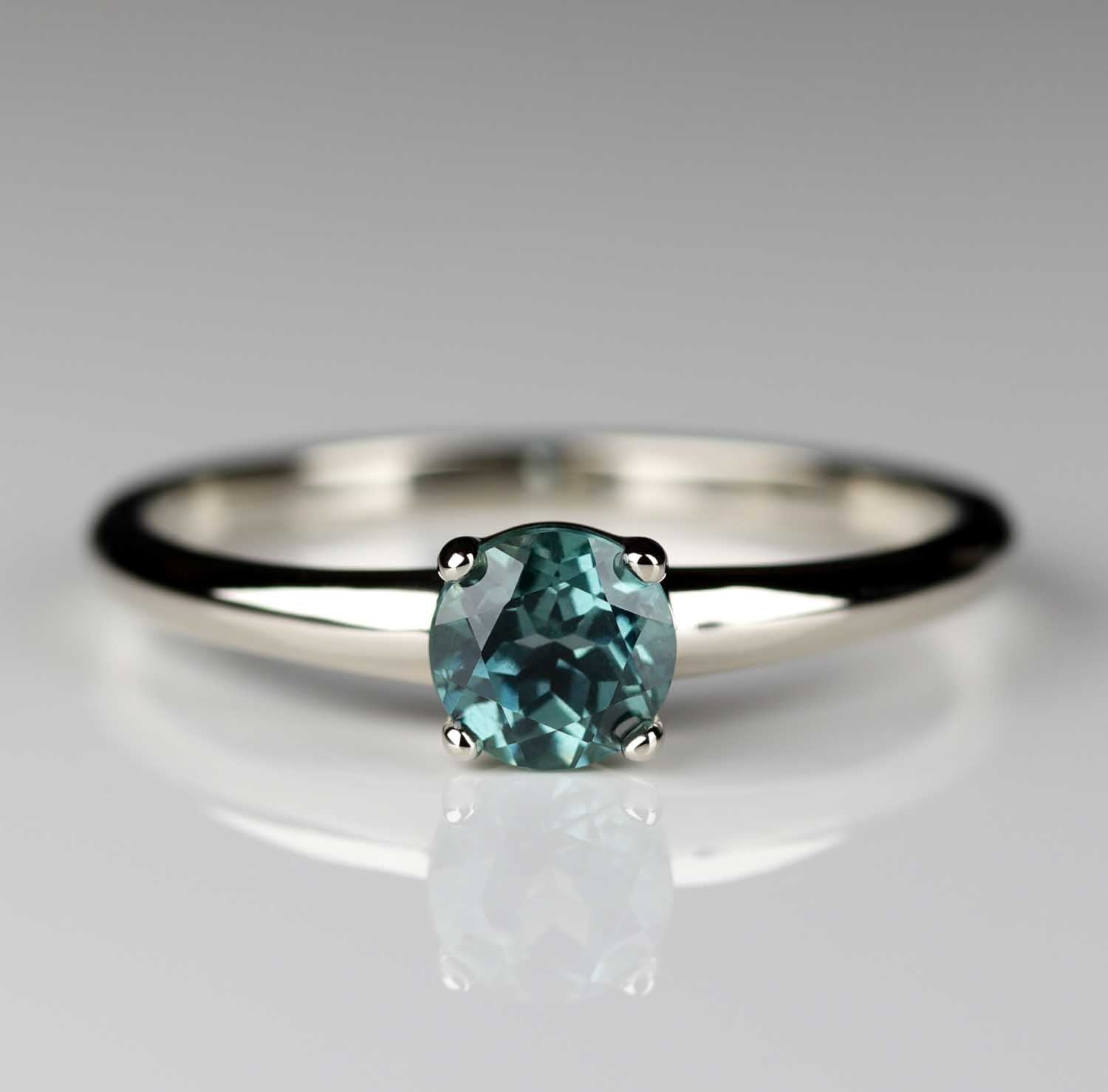 Our Low Base Four-Prong Solitaire with a 5mm round Malawi sapphire set in 14k white gold.