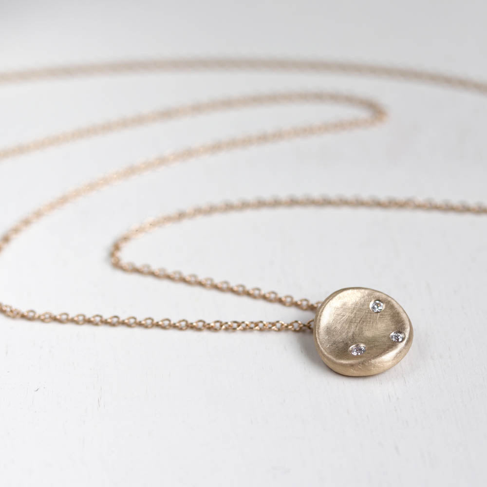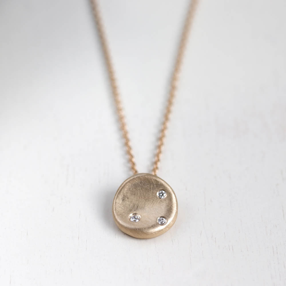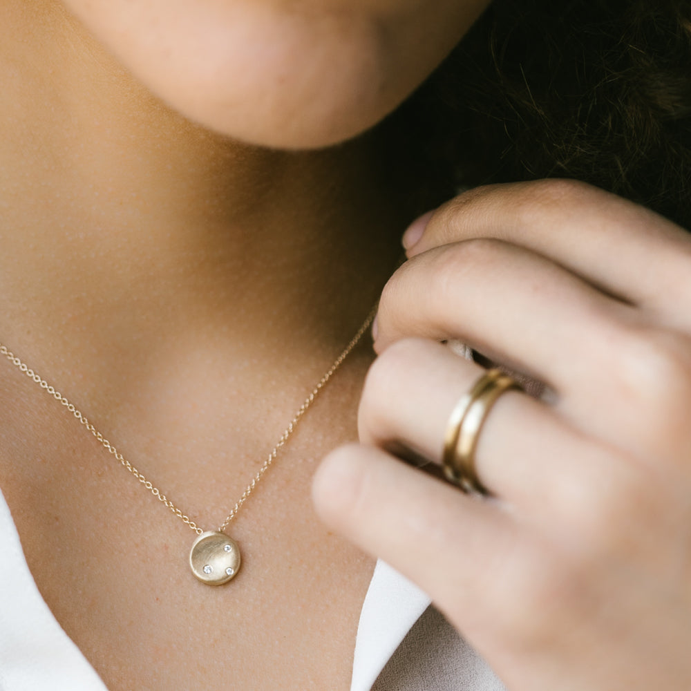 Organic and understated, this disc pendant is the ideal everyday piece. With a softly molded, concave surface studded with flush set diamonds that add a subtle sparkle, this pendant is the perfect start (or new addition) to your jewelry collection. Wear alone or layered with your other favorite necklaces for a personalized look.
