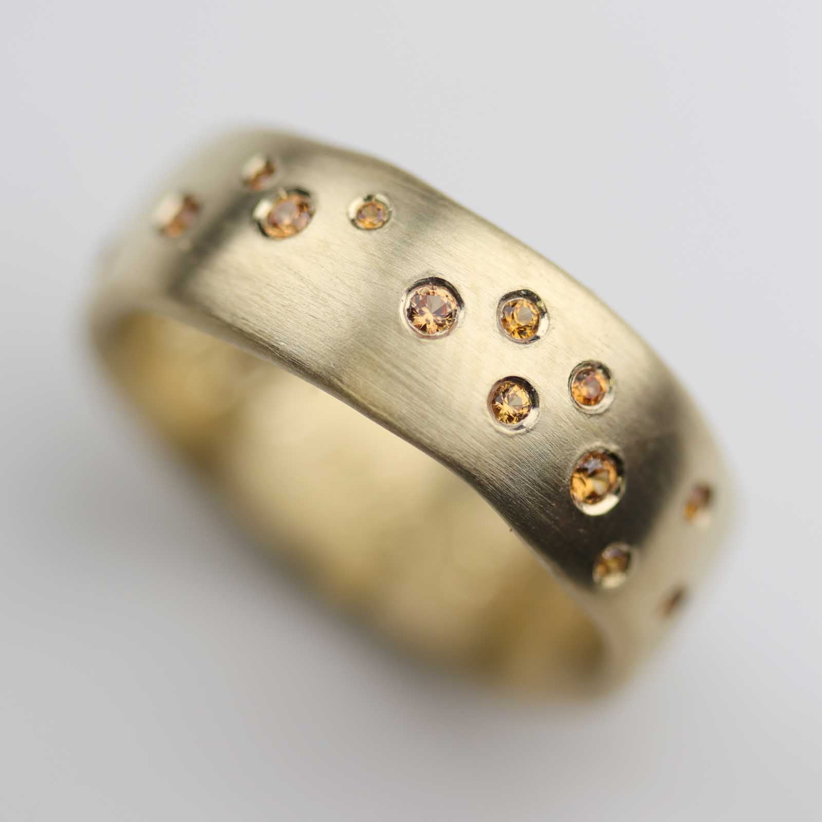 A custom version of our Celestial Sculpted Band in matte 18k yellow gold with 13 flush set orange lab-grown sapphires in sizes 1mm, 1.25mm, & 1.5mm.