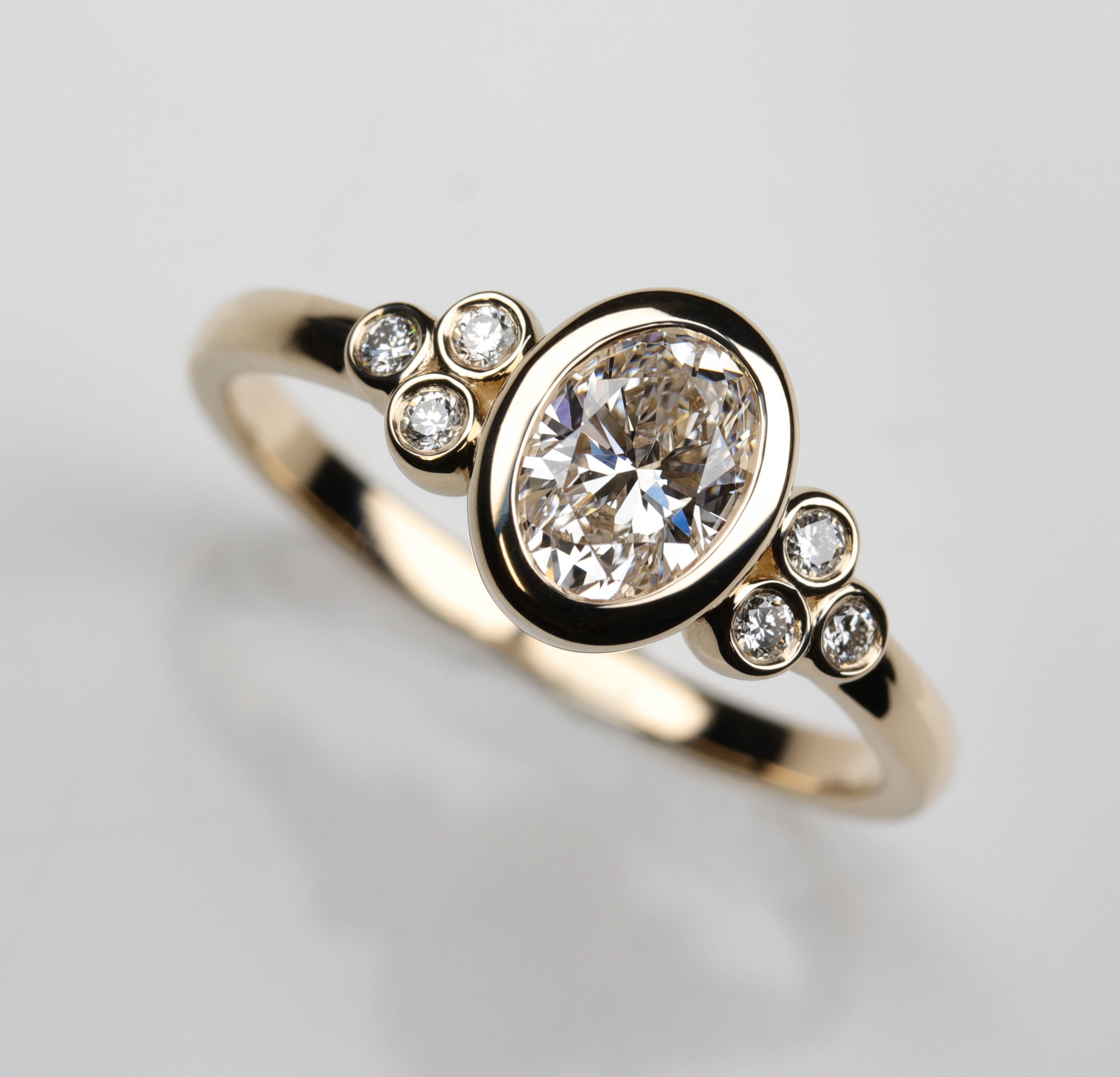 Our Bezel Set Seven Stone Cluster Ring with an Oval Lab-grown Diamond Center stone and Lab-grown Diamond Accent stones, set in 14k yellow gold with a shiny finish.