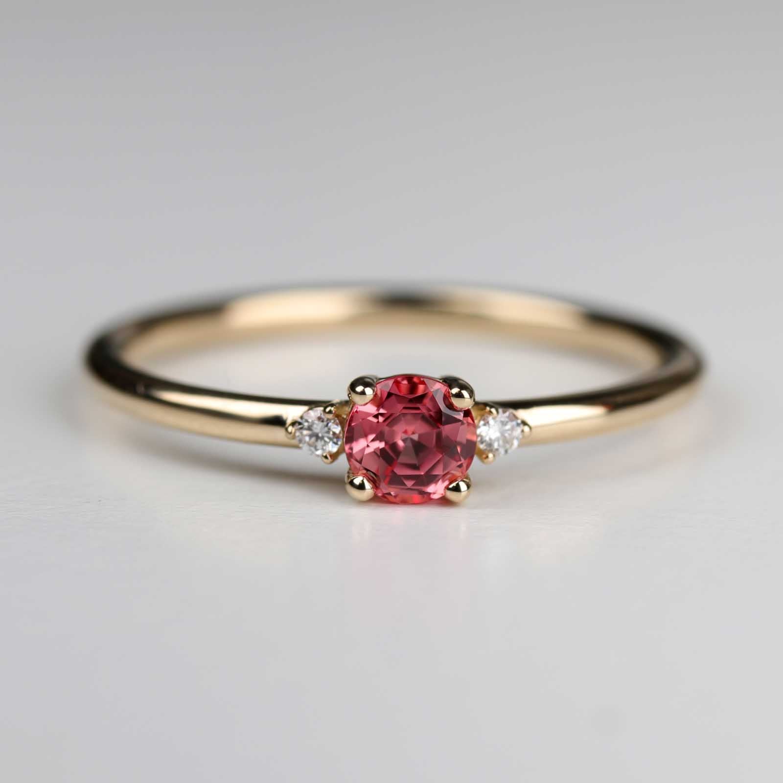 The Low-base Three Stone Stacking Ring with 4mm lab-grown peach padparadscha sapphire center stone and lab-grown diamond accent stones set in 14k yellow gold.