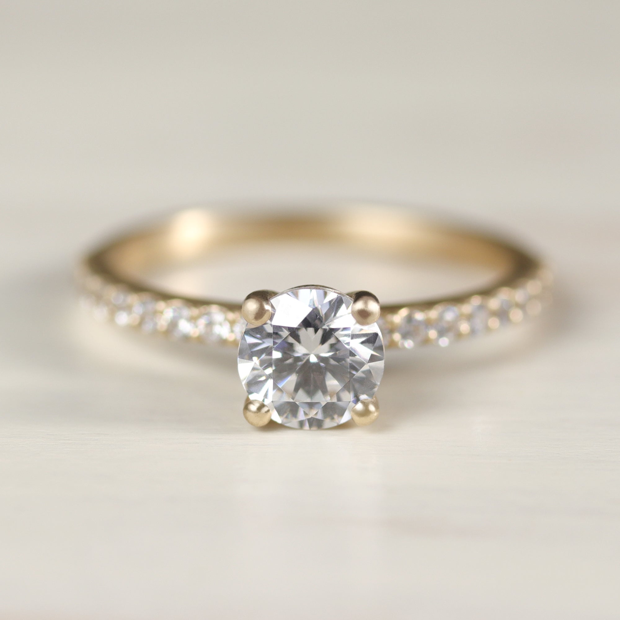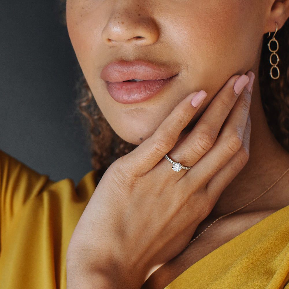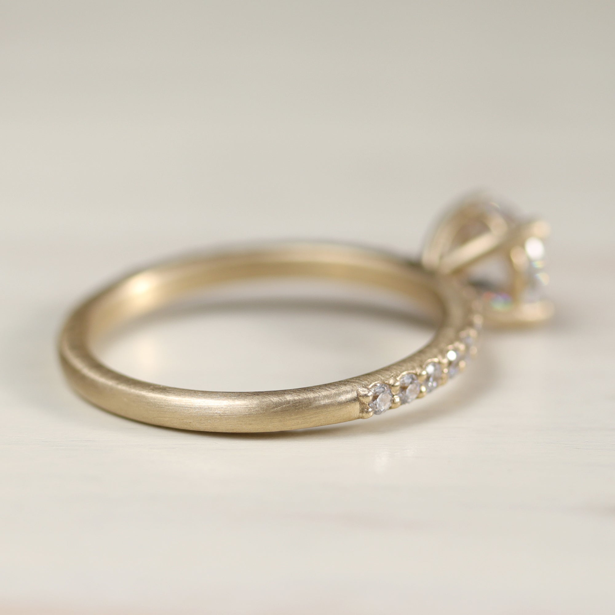 This sleek solitaire combines the minimal lines of our Basket Solitaire with a pave diamond band for maximum sparkle. With the stone as the focal point, you can't go wrong with this ring.
