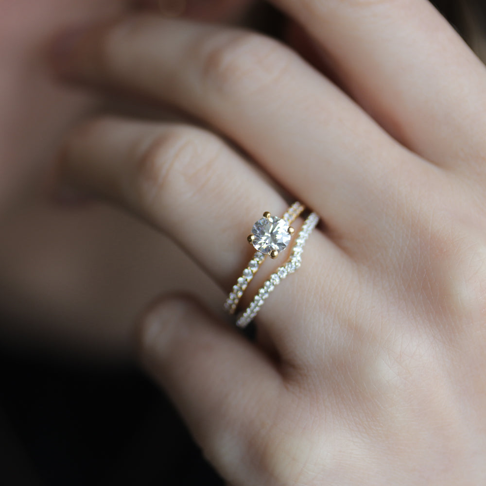 This ring is incredibly versatile and is designed to stack with a wide range of wedding band styles. Pair this ring with our Hand-carved Classic Band for a simple, classic look.
