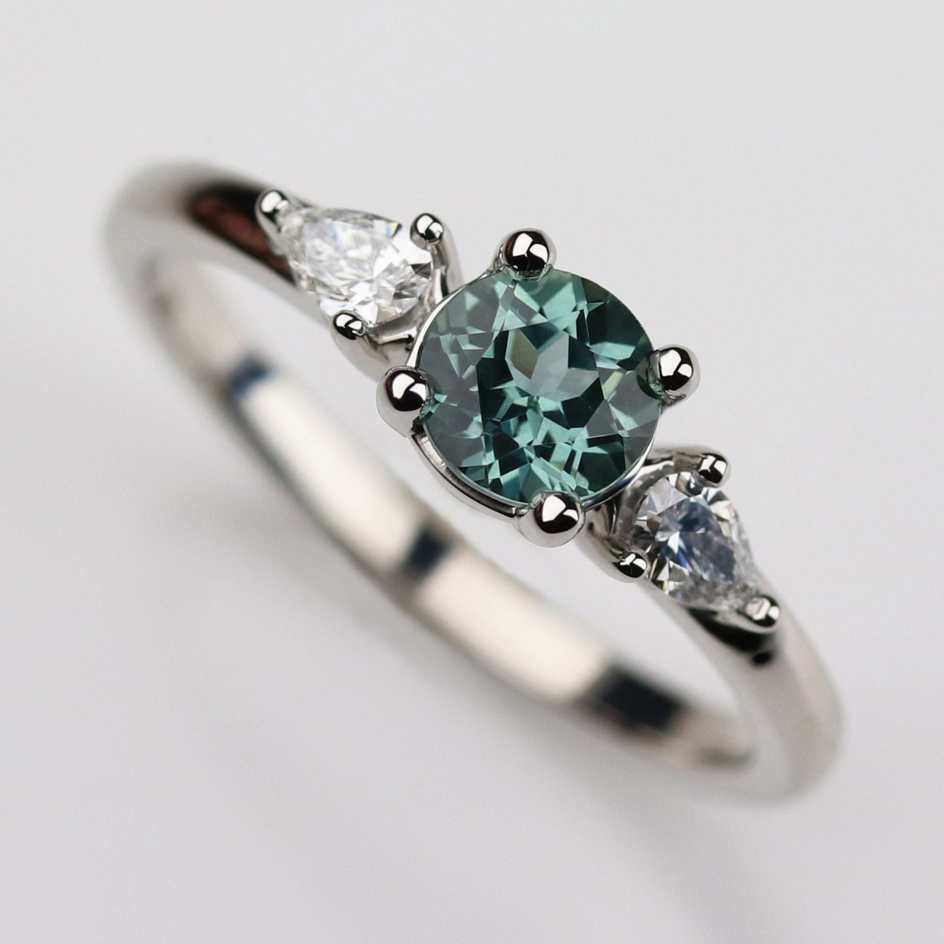 A custom three-stone basket ring with a 5mm round teal Sapphire center stone, and pear Lab-grown white diamond side stones. Set in Platinum with a shiny finish.