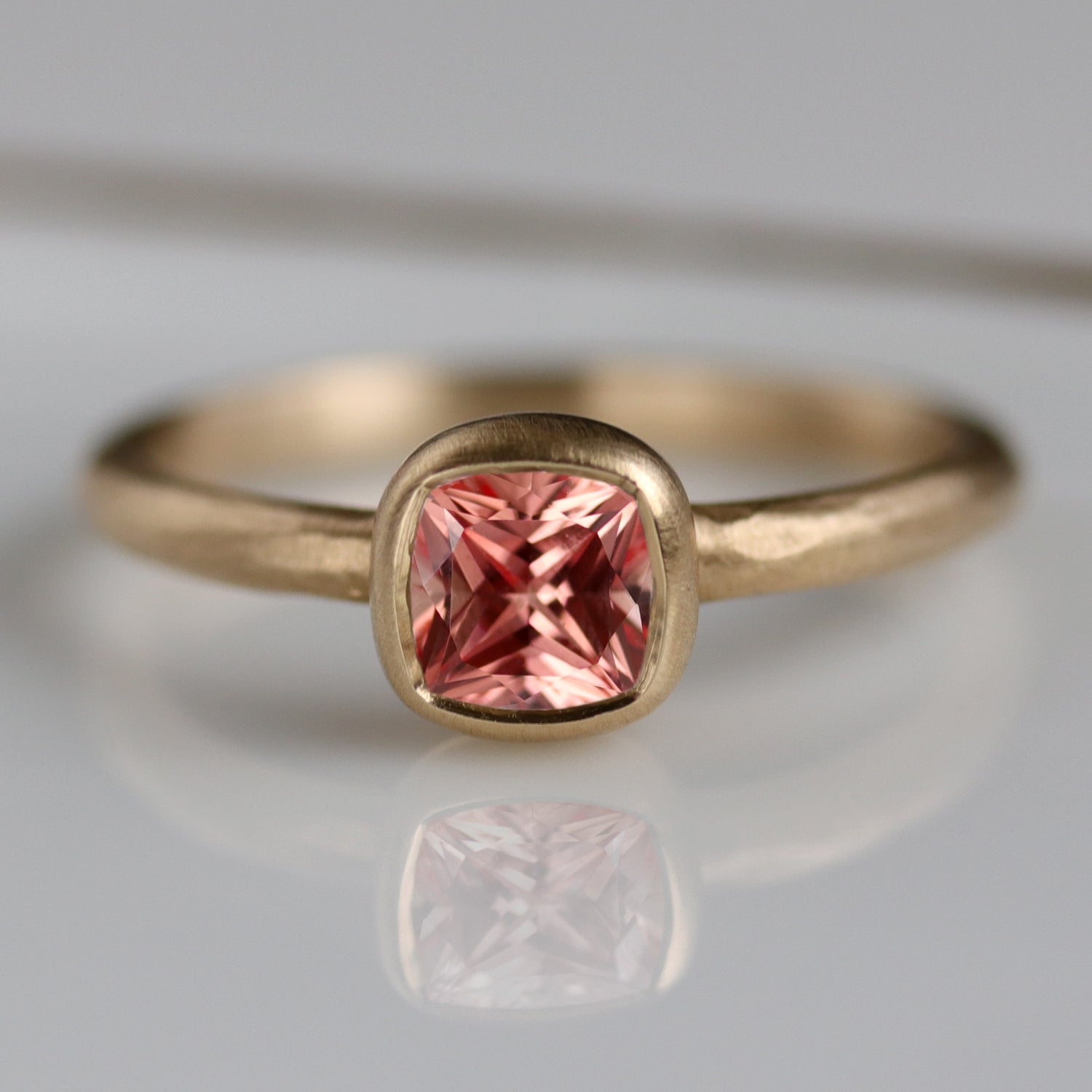 A Peach Chatham Padparadscha Sapphire in our 5mm Rustic Cushion Cut Engagement Ring, set in 14k yellow gold.