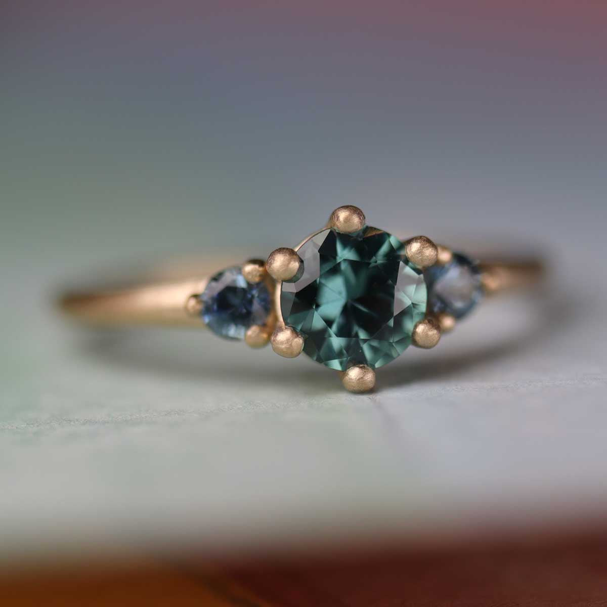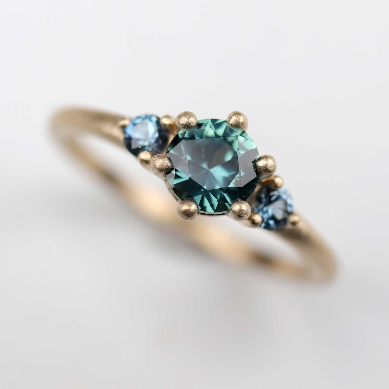 Our 5mm Prong Set Three Stone Ring with a 5mm Montana Sapphire center stone and 2.5mm Malawi Sapphire side stones in 14k yellow gold and a matte finish.