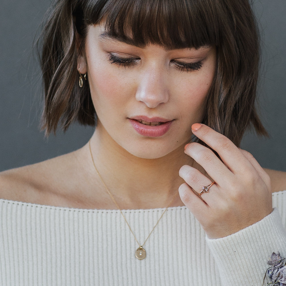 The ring pictured here is shown in shiny 14k rose gold with fair trade Australian salt & pepper rose cut diamond center stone. A recycled natural or lab-grown rose cut white diamond option may also be available. Please contact us for more information regarding availability and pricing.