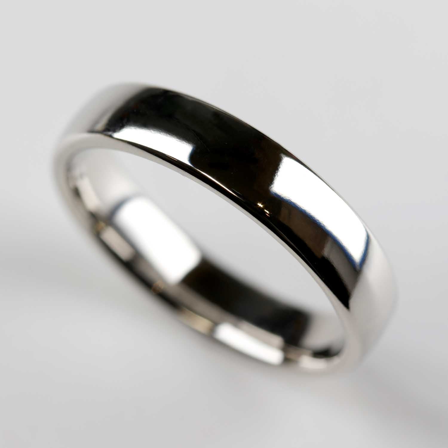 This wide ring has a slightly curved outer profile that gives it a defined, even edge line. The ring’s exterior has a smooth, lustrous finish, while the slightly rounded, comfort-fit interior provides a snug, easy fit.