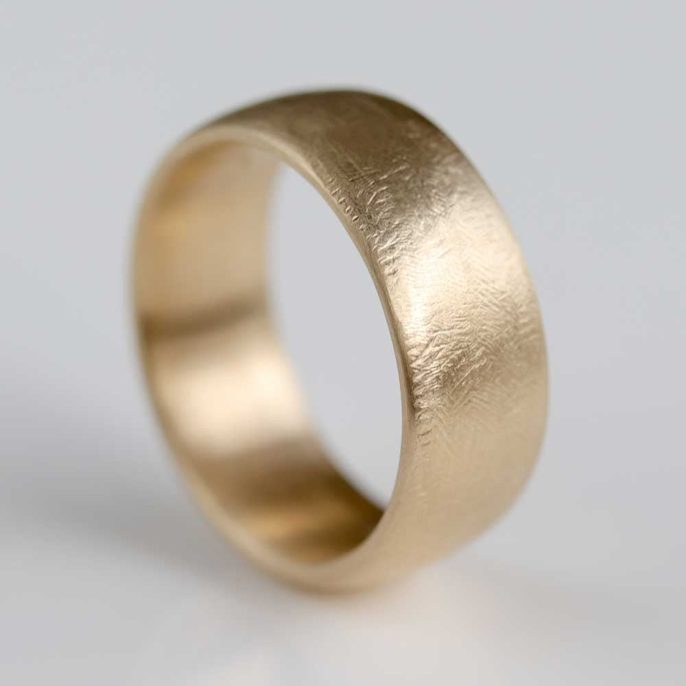 Abstract art on a ring! That’s how we like to think of this slightly rounded classic band. The exterior is hand-carved with a playful pattern of marks that resembles the free form lines of an abstract painting. This texture contrasts nicely with the smooth, even finish of the comfort-fit interior.