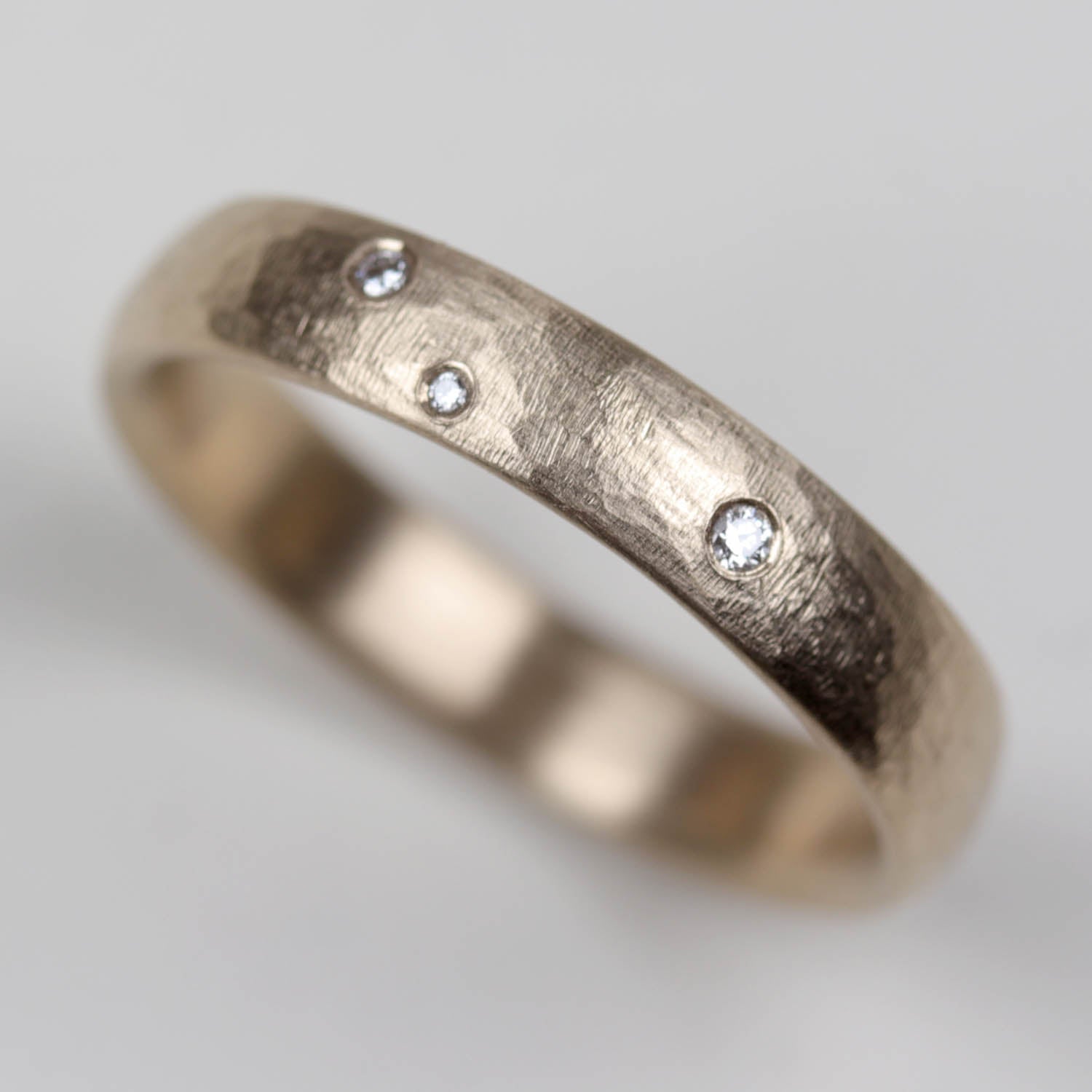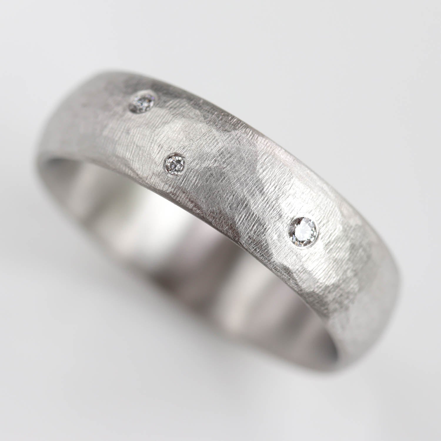With a sprinkle of diamonds across the surface, this textured classic band is reminiscent of constellations in the night sky. The texture and the diamonds catch the light, striking a refined balance between rustic, artisan appeal and clean modernity.