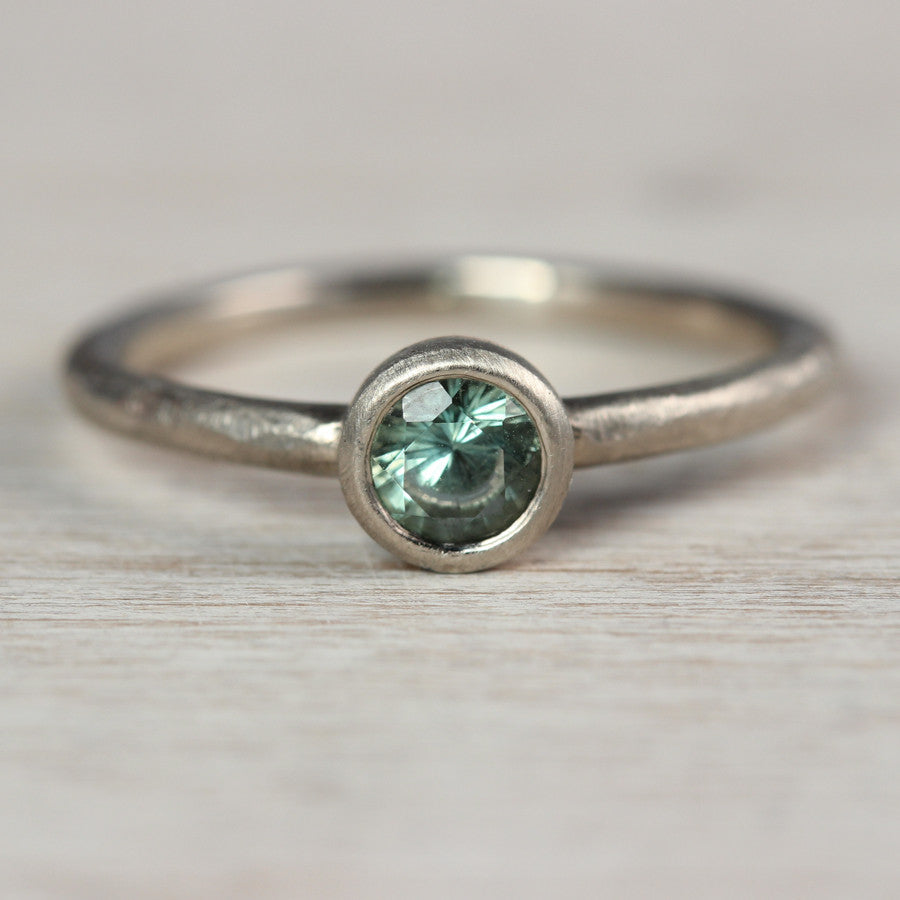 The 4mm Rustic Engagement Ring in 14k white gold with a fair trade pale green Australian sapphire.