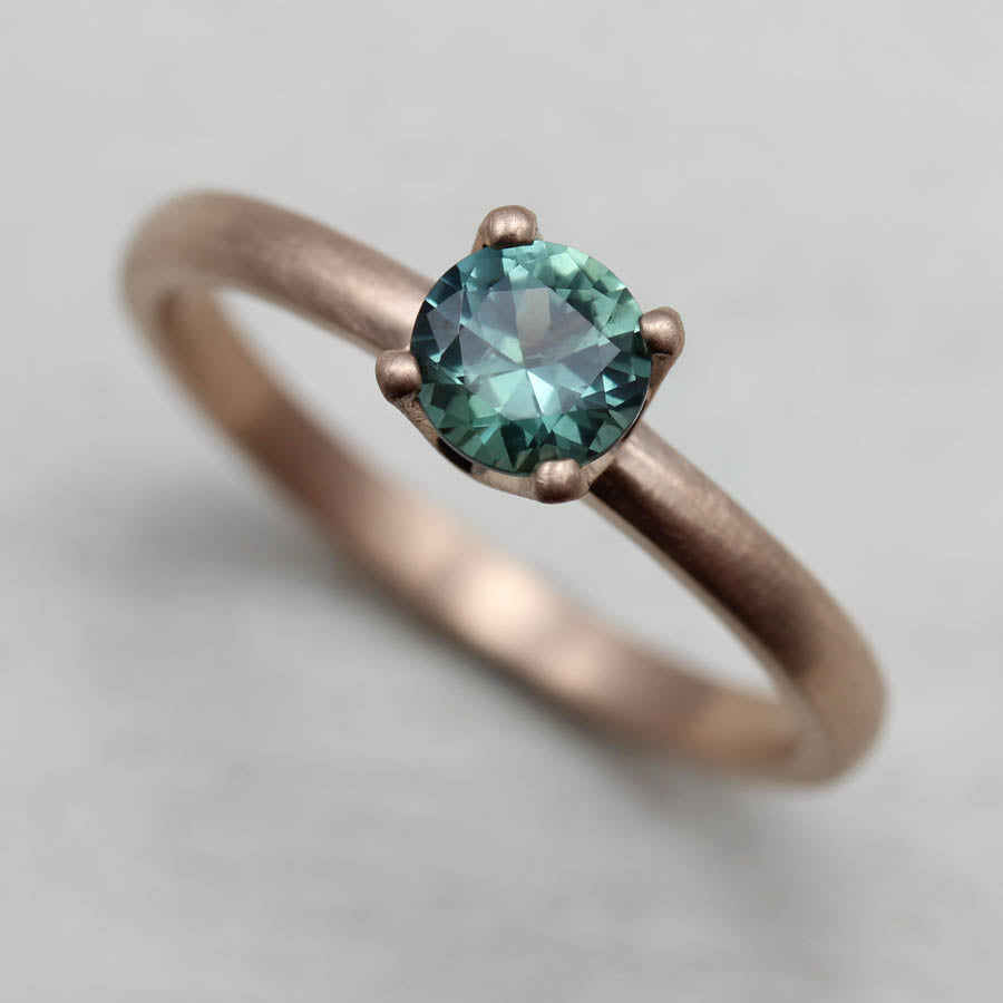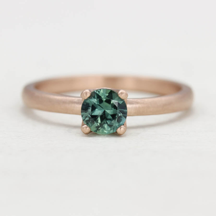 Our 5mm Crown Solitaire Engagement Ring (approx. 0.5ct) in matte recycled 14k rose gold with a fair trade blue green Montana sapphire.