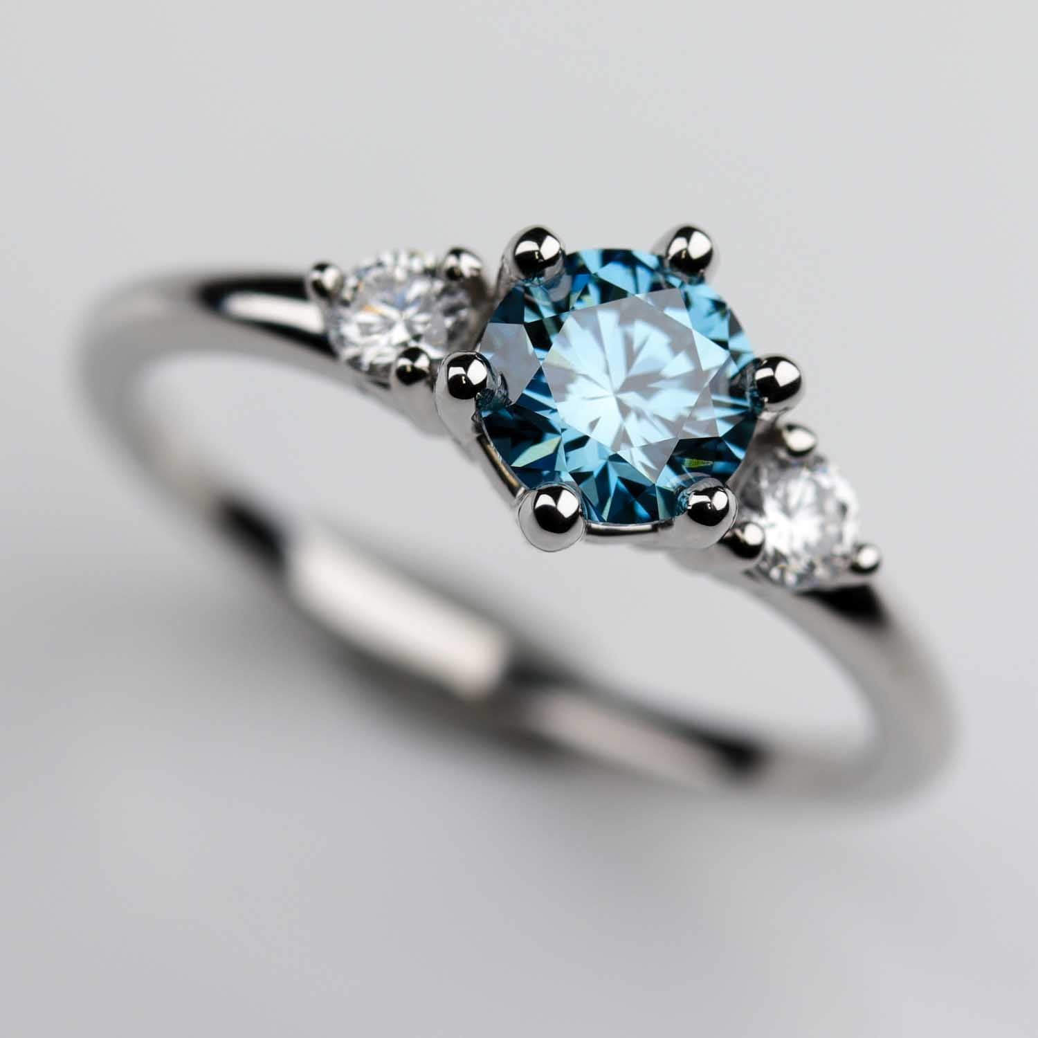 Our 5mm Prong-set Three Stone Ring customized with a fancy vivid blue lab-grown diamond center stone and lab-grown diamond side stones in platinum.